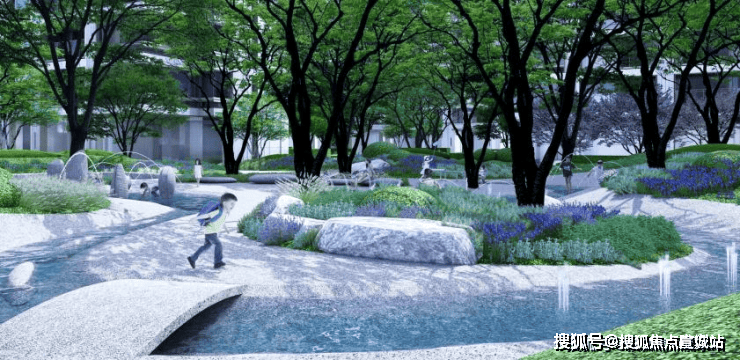 三园悦心·清溪,是园区内最大的水景洽谈休憩空间。结合绿化、地形,打造游赏、自然、休憩水景。