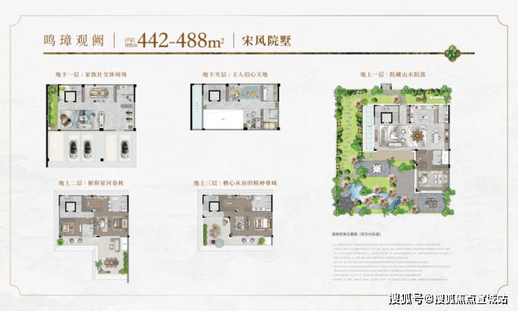 在合院产品中,开创性引入“一宅六院”设计,构建出地下挑高光院、南向诗意庭院、北向入户礼院、二层观景静院、三层巨幕心院、三层露台星院。