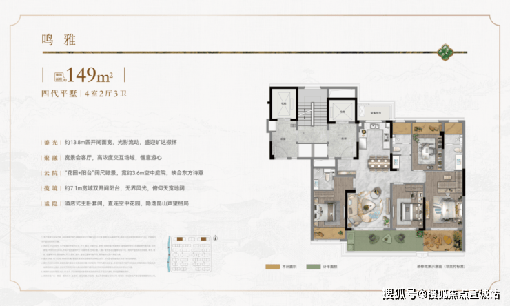 作为昆山首座「庐」系作品,绿城·鹿鸣东方以“宋风雅韵”为理念,规划约1.2容积低密住区,仅71席面积235-350㎡的宋风合院与158席建面约149㎡、178㎡的四代平墅。