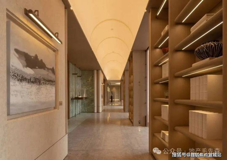 参考台北嘉佩乐酒店的叙事风格呈现第二重门厅。以一座环形的前场庭院作为业主归家的情绪整理空间,打造从繁华到宁静的空间过渡,开启度假般归家体验。