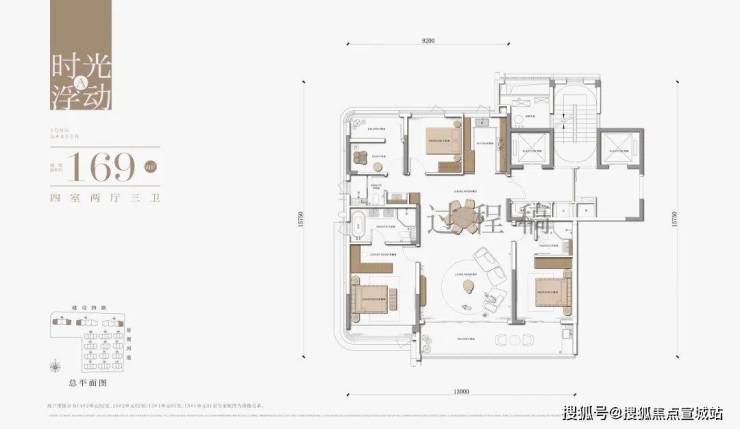 规划5栋17层高层(190套)与6栋4层滨水联排(42套),高层面积段169-199㎡,联排300-340㎡。