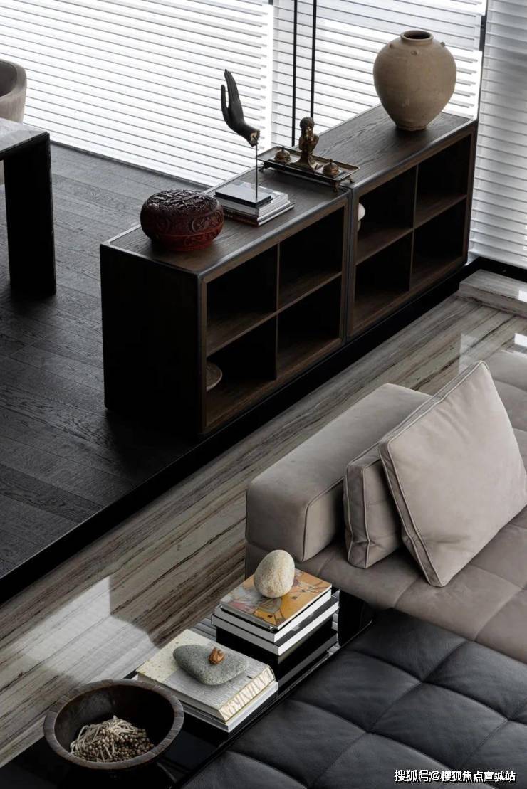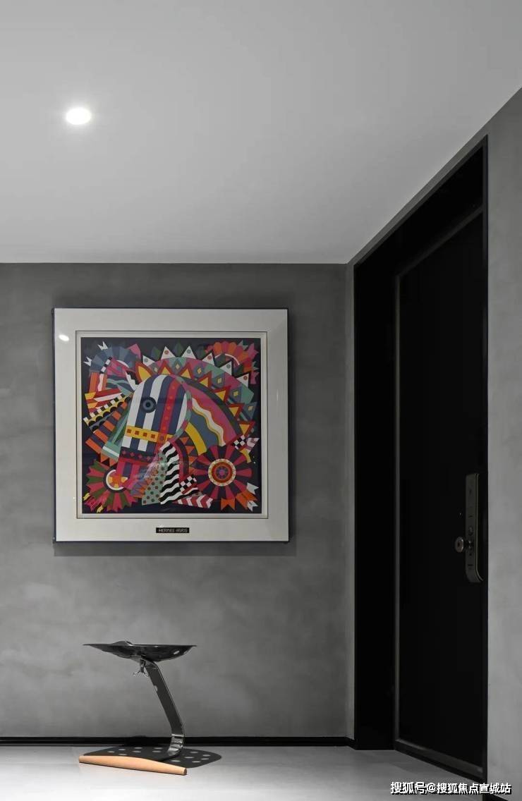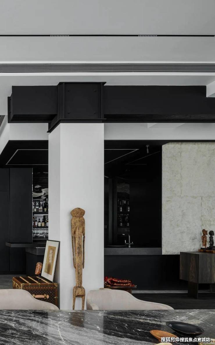 空间是光影的容器,自然光穿透白色的纱帘给会客厅加了一层摩登的滤镜。两侧纱帘光影通透,暗香浮动,几丝波影乍如烟。一处吧台,临烟火,酌清欢。烟火清欢,一半一半。