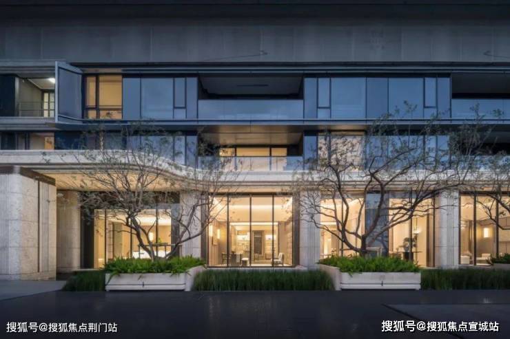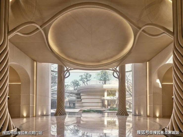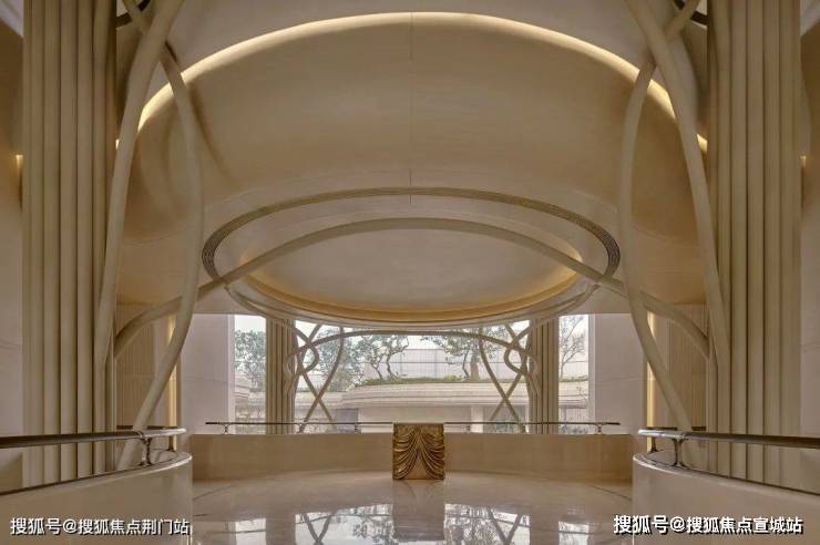 大门内外两重门厅景墙运用月光米黄石材近1000 方,搭配香槟金金属线条,汲取爱马仕全球旗舰店的双曲面叠墙造景手法,增加景墙奢华质感。 项目沿河的楼幢整体上抬,也就是——抬地式。好处在于地库通风,客户行车归家动线更合理。