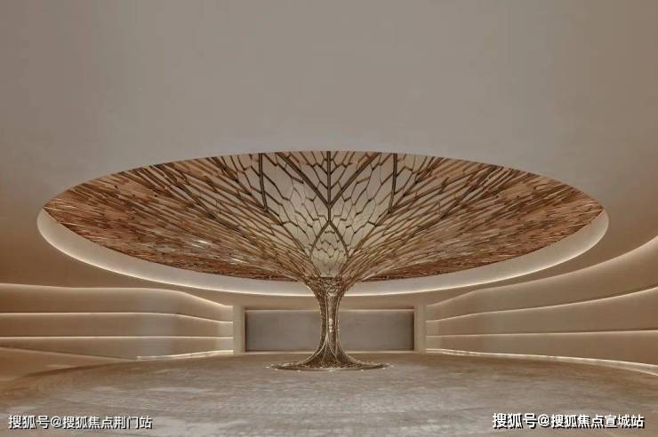 大堂「生机之亭」高约15米,凌空矗立为归家动线的核心枢纽。藤蔓枝干与天花交织缠绕,地面与顶面纹理呼应,共织以森林韵律为魂的生态栖居归家仪式。