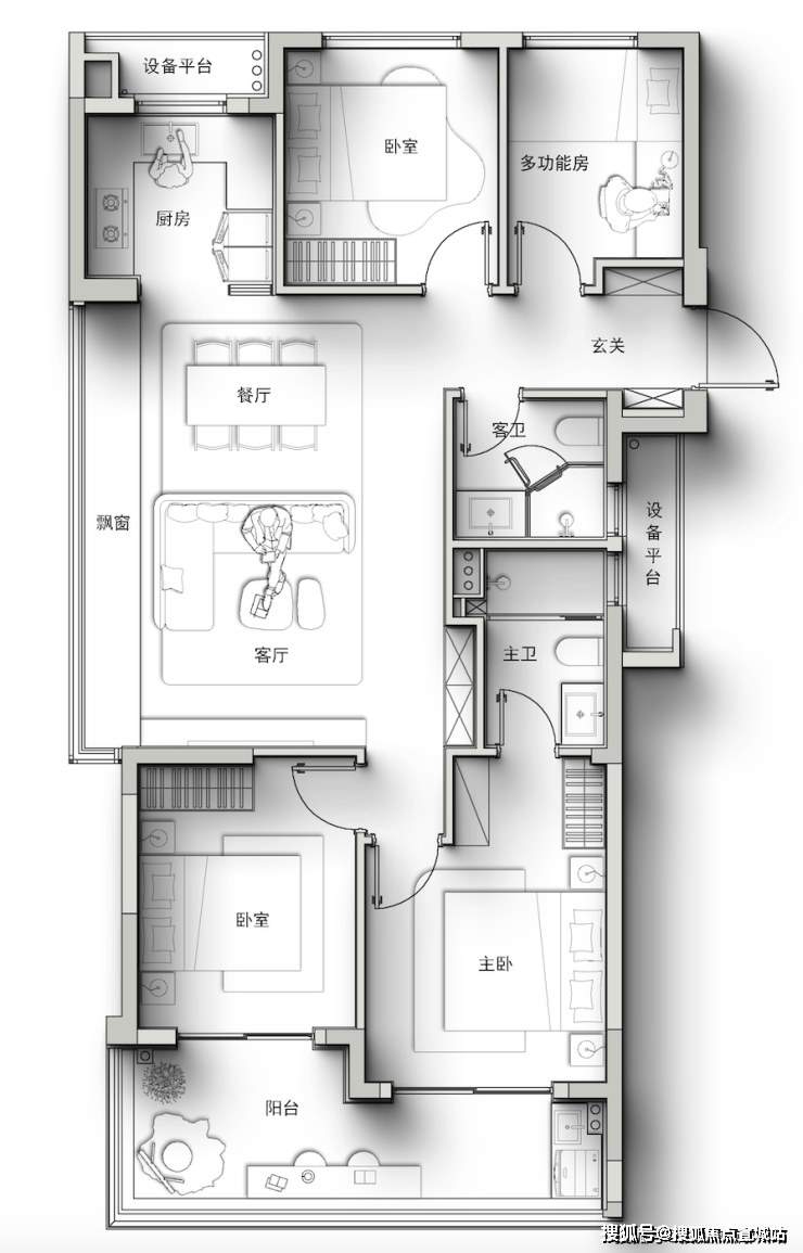不仅做到了大边厅+四房,而且还带一个进深约2米的转角阳台(很多豪宅阳台进深也不过1.8米),就像自带一座空中花园。