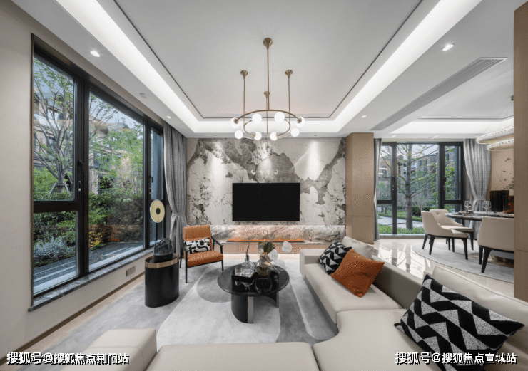 它还一改海派风格的小开窗,而是采用大开窗+大面积落地窗,窗墙比大幅提升。站在样板房客厅向外看,室内与花园的风景几乎融为一体。