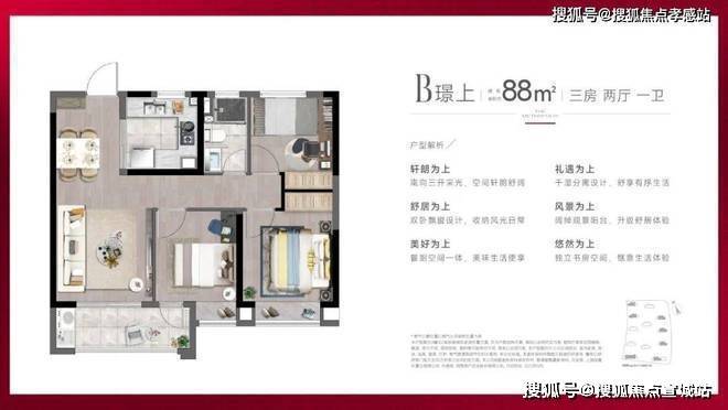 深业·深安上居官方售楼处预约热线:400-8862-334该户型在88㎡户型的基础上,将尺度进行了升级,双卫设计,三开间朝南+动静分离,室内采光面非常大,通透明亮。