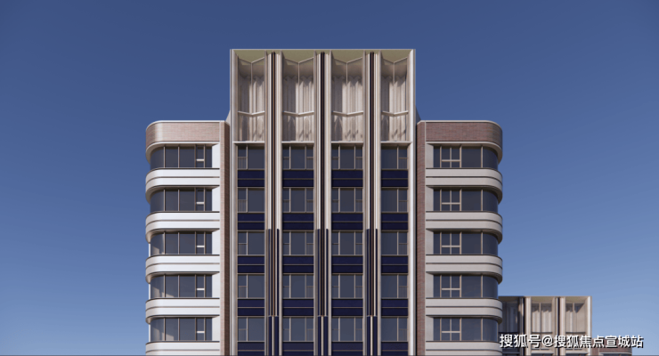 住宅立面颜色以珍珠蓝为核心,搭配香槟金、海派红,两侧还采用弧形设计,比方正的建筑看起来更柔和,也让视野更大化,实现约270°观景。