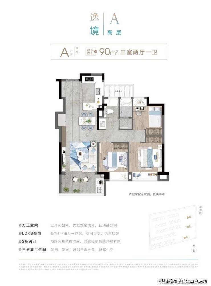 金地嘉境目前主力在售建筑面积约90㎡高层户型,总价约300万起!该户型功能性上做到3房2厅1卫,格局上实现了南北通透+三开间朝南,