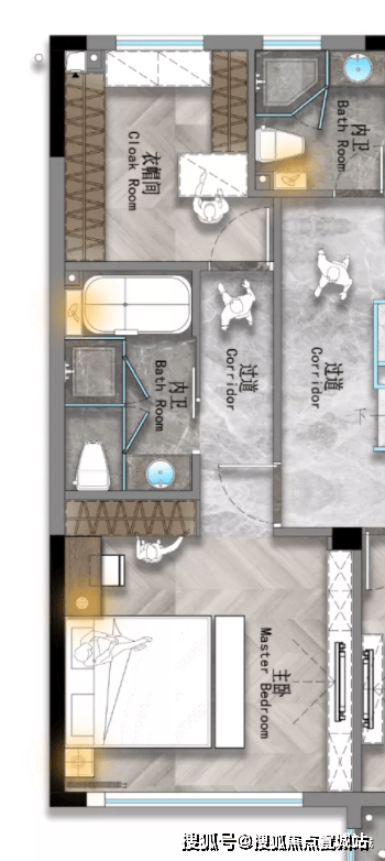 主卧是套房的格局,可以分割为卧室+L型衣帽间+大进深内卫的格局。