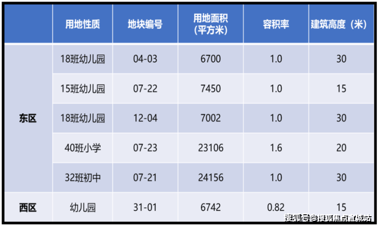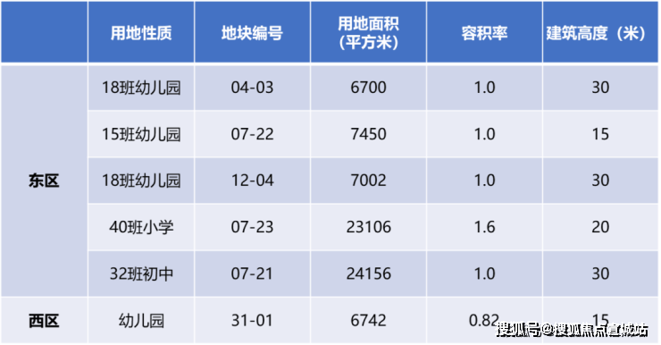 东区和西区最大的不同在于教育和公建设施配套,东区人口更密集,有5幅教育用地,从幼儿园至初中;而西区仅有1幅教育用地,作为幼儿园。