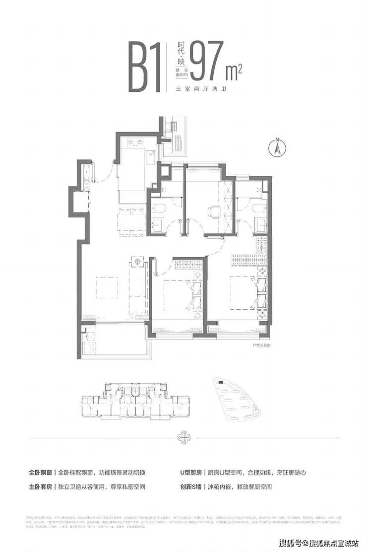 建面约97平的三房两厅两卫,在89户型基础上多了一个卫生间,450-500万级别功能性更强。