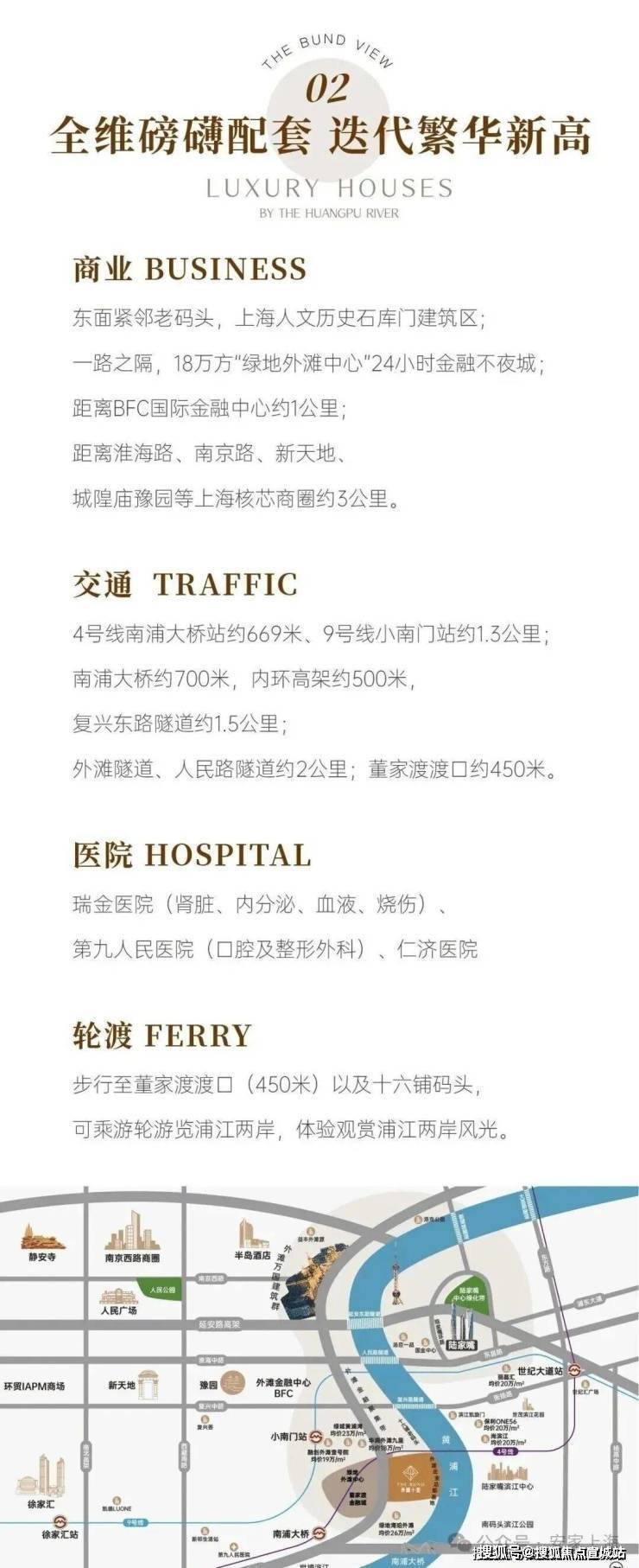 交通配套方面:4号线南浦大桥站669米,9号线小南门站1.3公里,南浦大桥700米,内环高架500米,复兴东路隧道1.5公里、外滩隧道、人民路隧道2公里,董家渡渡450米