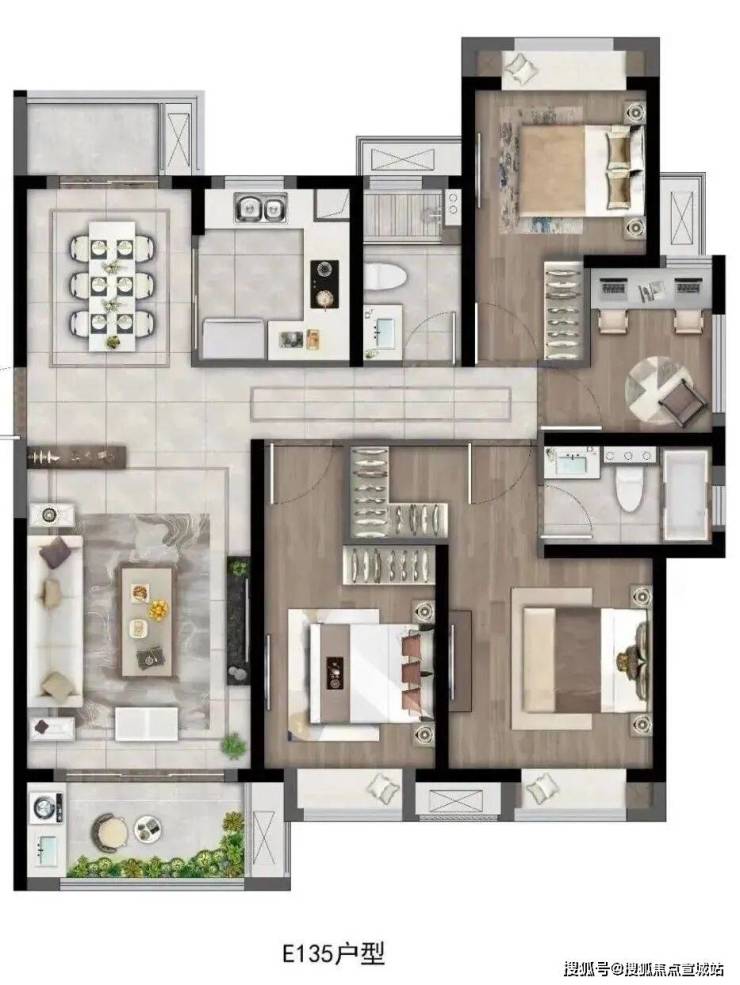建面约135㎡4房2厅2卫,做到了三开间朝南+双卧室朝南+主卧套房设计+南北通透+动静分离+南北双阳台,这是一个“一步到位”的大4房户型。