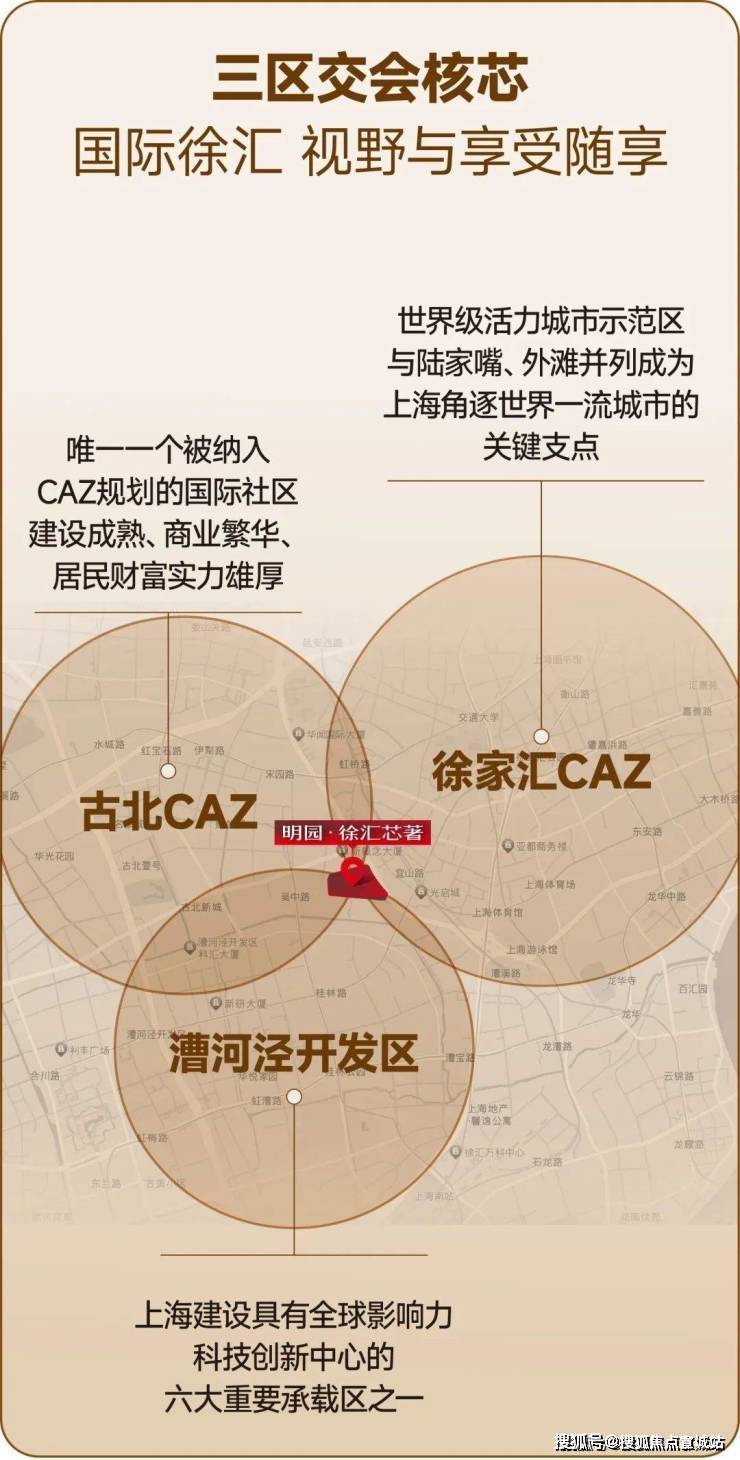 三区交汇 催生活力与繁华,明园·徐汇芯著坐拥徐家汇CAZ、古北CAZ、漕河泾开发区,三大辐射圈,享国际繁华版图。