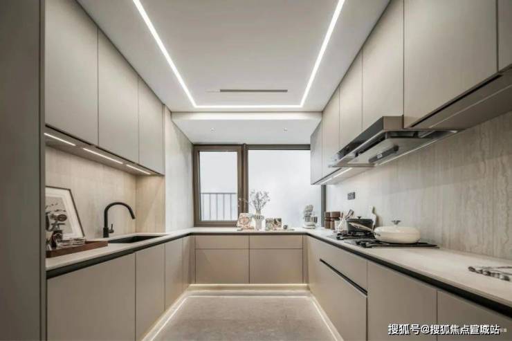 u型厨房,储物空间非常足,柜体也是偏哑光质感。
