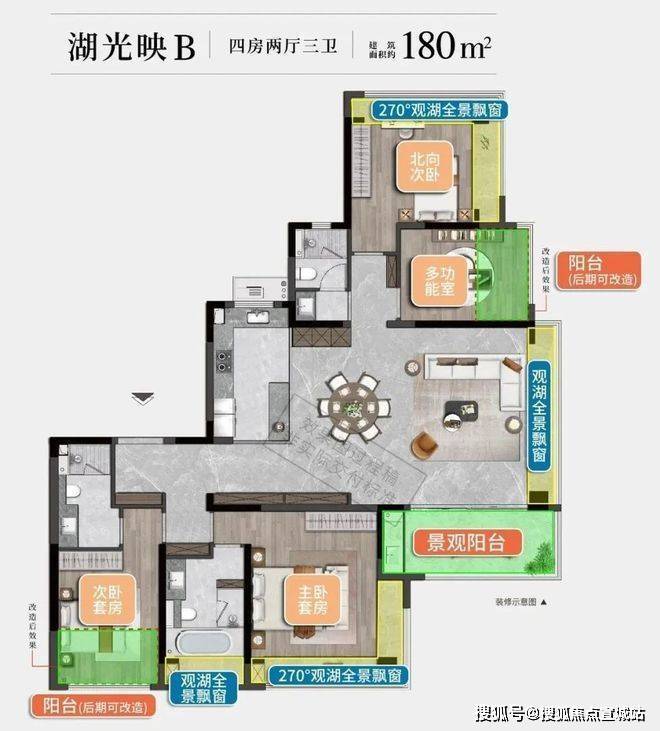 东边户整体布局呈L型,主卧、北次卧均设计全景飘窗,餐客厅由东侧飘窗+南向观景阳台形成270°广角视野,放眼望去,满目皆是沙洲湖湖景。