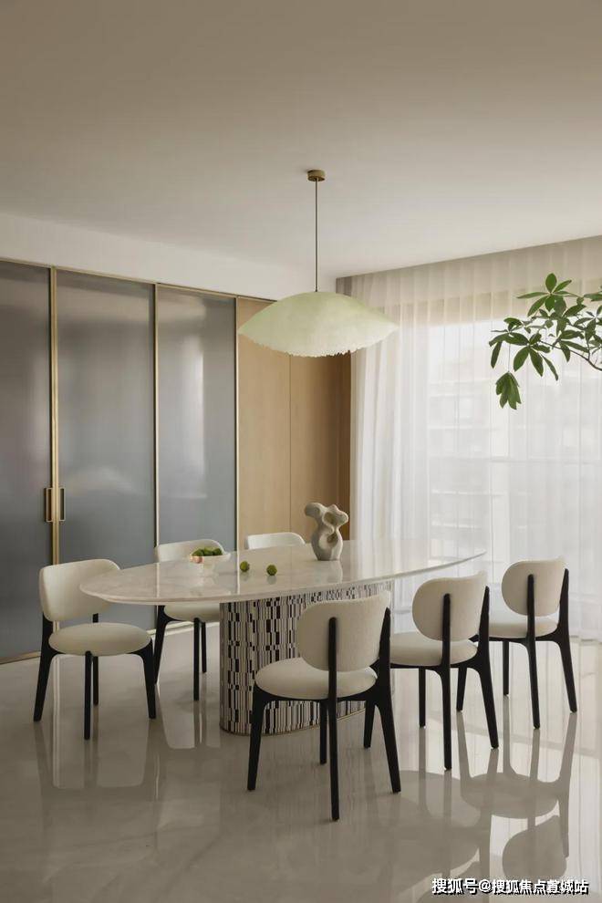 餐厅的设计采用了客厅的弧度元素,鹅蛋形的餐桌搭配轻巧的黑白椅,底座的黑白相间木皮增加了空间的艺术感,厚重的底座不再沉闷。