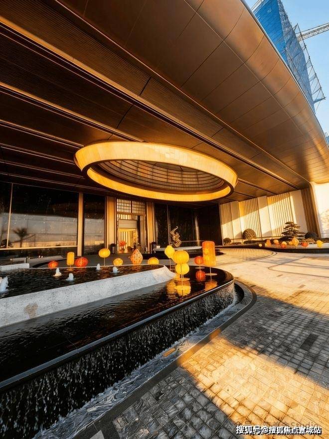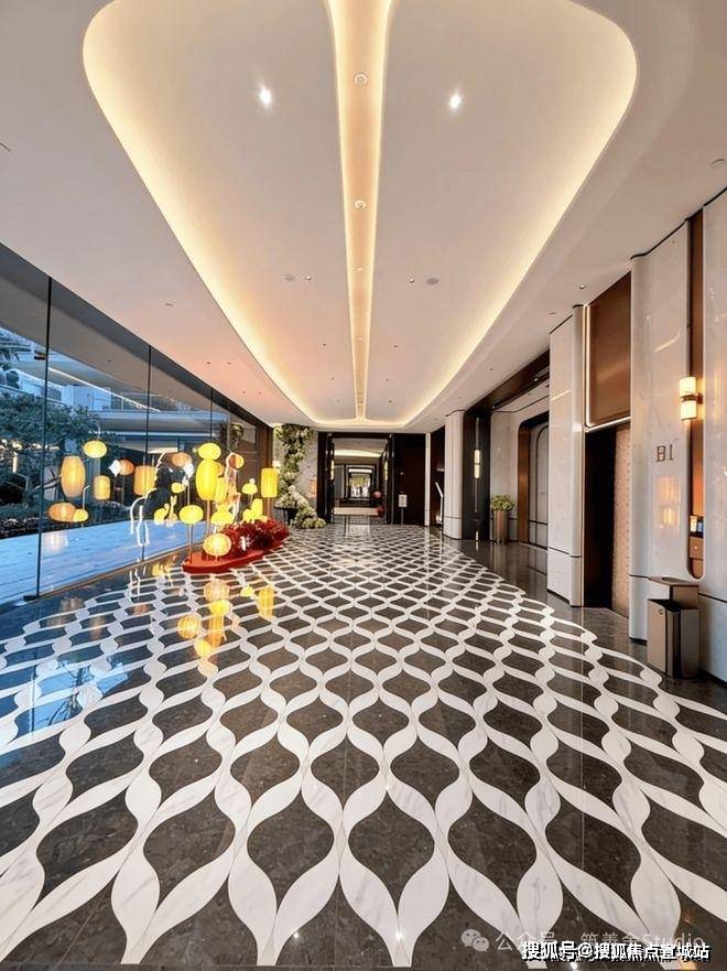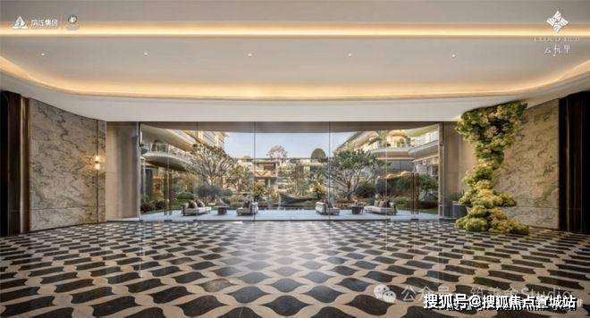 小区大门以“云扉初开”为灵感,打造具有仪式感的礼仪入口。宽约66米、高约8.6米的恢弘门庭,与酒店式归家大堂共同构筑,打造出极具仪式感的序厅,瞬间开启归家的尊崇心境。入口处精心打造的树阵水院,以静谧尊贵的氛围迎接归家。巧妙运用高差设计,通过层层递进的景观节点,优雅地引导业主步入社区深处。