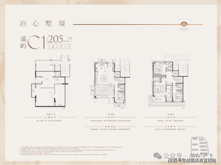 户型特点:下叠边套,南向面宽约9米,客餐厅同宽约5.8米,空间开阔。一楼设南向卧室,采光好且视野佳。二楼为三套房+主卧总统套房设计,主卫南向,可容纳浴缸和双台盆。地下室方正,附赠采光井,利用率高。