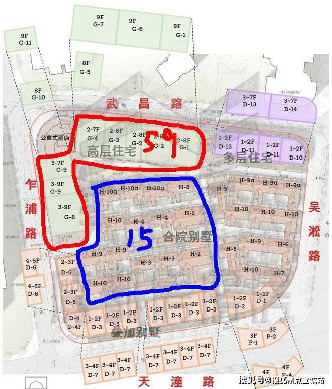 【天潼198】住宅产品户型多样,达到42种,共125套住宅单元,从图示来看,全部是风貌住宅产品。以下为首开楼栋图示,59套小高层+15套合院别墅;