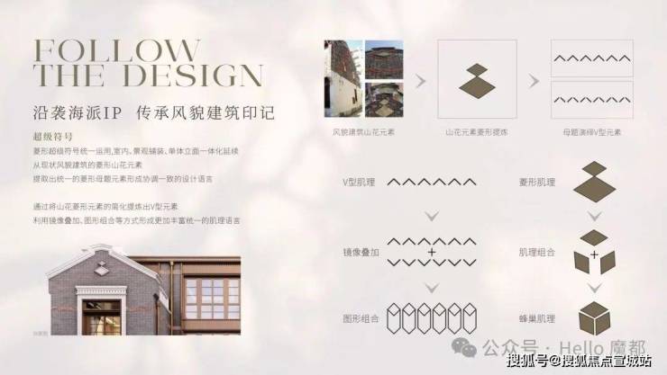 超级符号:菱形超级符号统一运用,室内、景观铺装、单体立面一体化延续