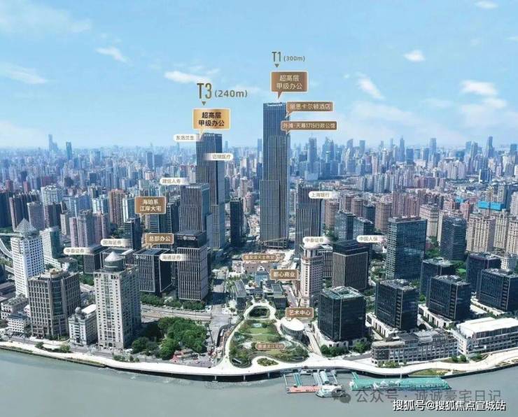 T1-300米超高层塔楼上部46-62层为五星级酒店(丽思卡尔顿)、38,40-45层行政公馆,中部7-37层为甲级办公,底部为商业及大堂。