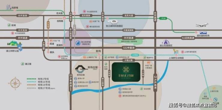 交通配套:距 16 号线新场站直线距离约 2 公里,可换乘地铁 2/7/11/13/18 号线,周边规划 27 号线新场古镇站。项目向东 600 米即达 S2 沪芦高速收费口,可连接 S32 申嘉湖高速及 G1501 绕城高速,直达浦东国际机场;项目向西 4 公里即可到达 S3 沪奉高速(在建中)。