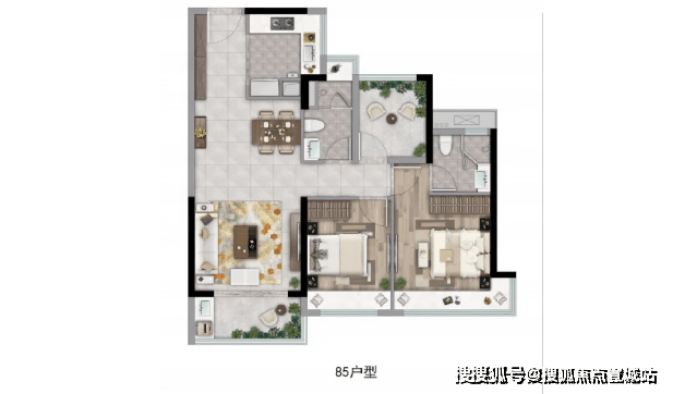 约85㎡ 2+1房2厅2卫:增加了更多的活动空间,更适合追求舒适生活的家庭。