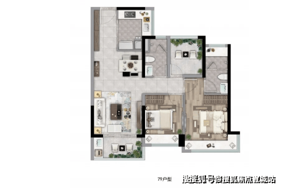 79㎡ 2+1房2厅2卫:紧凑而不失温馨,适合年轻夫妇或小家庭。