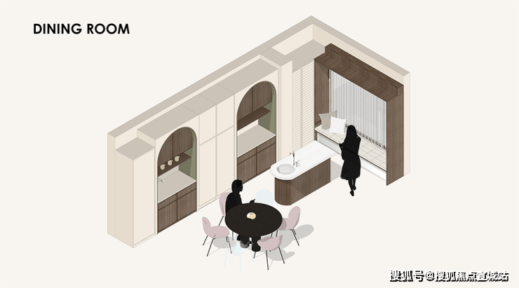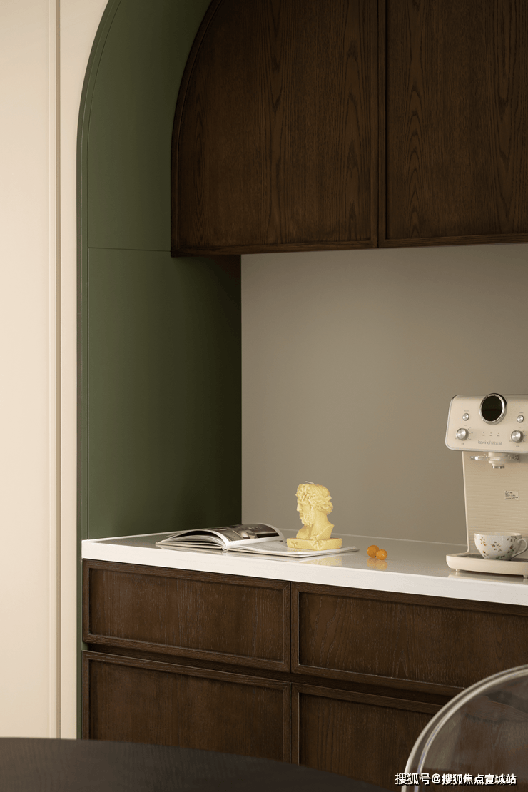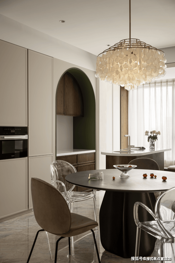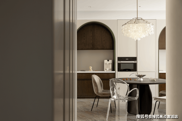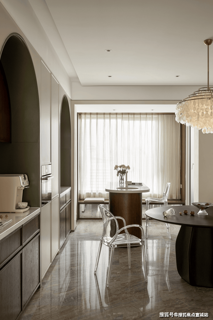 厨餐厅,内置双拱门造型,利用空间穿插、错景,划分餐厅与西厨区,开放互动气质与当代审美相结合,隔而不断,界而未界,留给空间更多的想象和延伸。