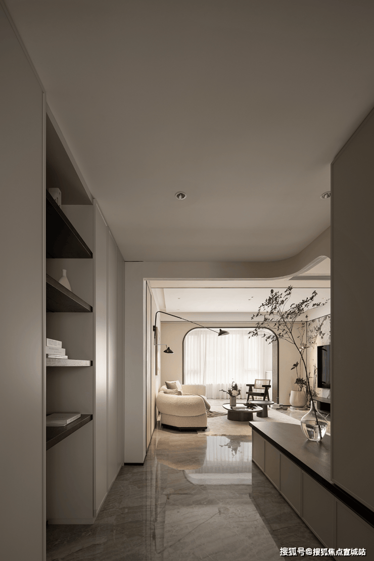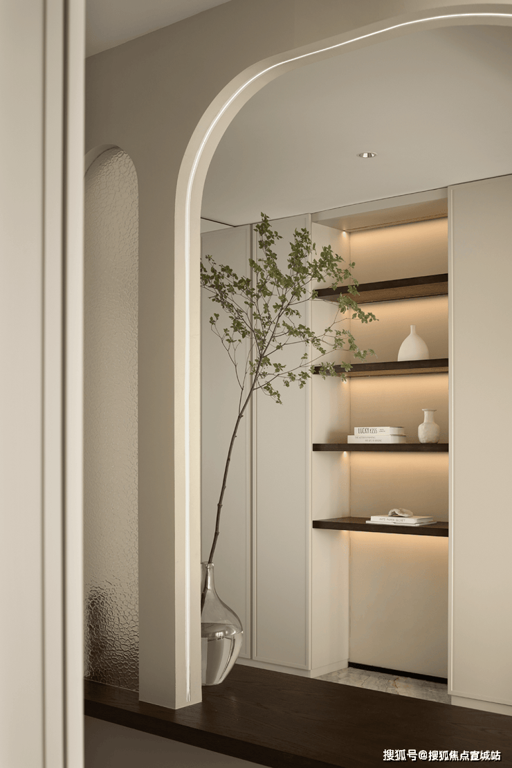 挑高扇形弧度造型、内置收纳玄关柜,与自然质感的材质虚实结合,绿植与灯光的适度渲染。
