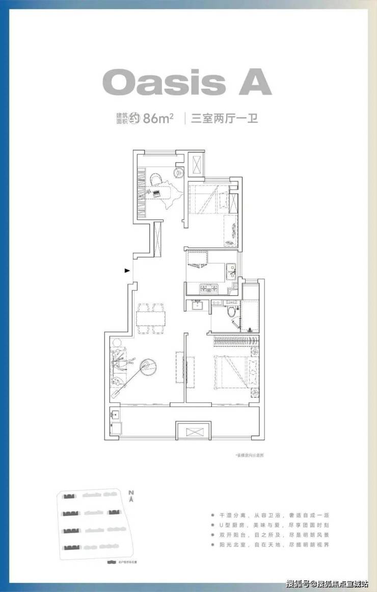 建面约86㎡三室两厅一卫设计,U型厨房,操作动线合理,卫生间三段式干湿分离设计,功能互不干扰.对于刚需购房者而言,直接冲~