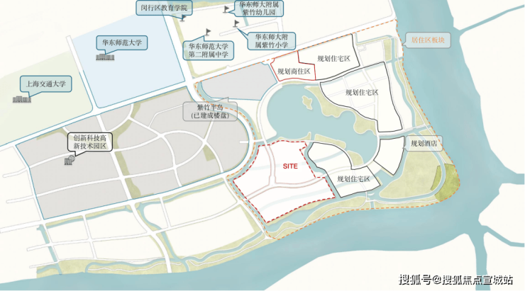 项目西侧是紫竹高新技术园区、北面是交大和华师大校园,以及紫竹基础教育园区,包含幼儿园至高中全龄段教育配套。