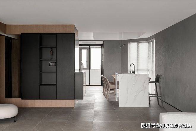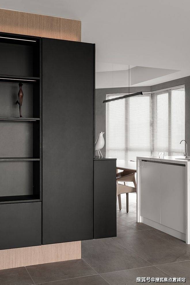 客厅电视面做黑色内嵌开放格,一整面形成一个整体,与玄关的黑色柜体呼应,造型简洁却不乏储物。