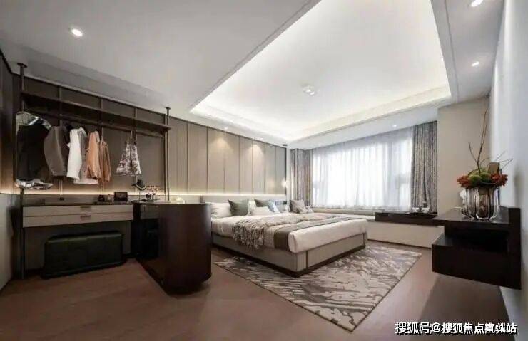 主卧豪华套房,面宽约5.4m,带衣帽厅和奢华卫浴体系。值得一提,还有一个南向次卧套房,卫生间也是朝南设计,避免暗卫。