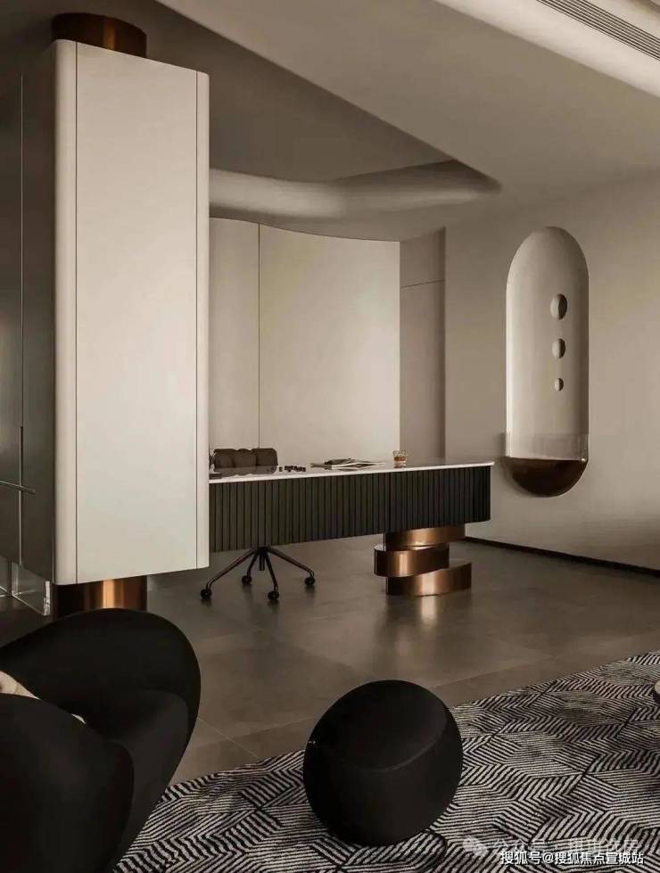 在玄关的后侧藏匿着一处茶室,黄铜色的金属桌脚略显奢华.