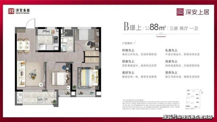 深安上居的12栋17-18层小高层,围绕生态景观错落排布。开阔的楼间距不仅让组团景观更加大气,也保证了采光与通风效果。建筑面积约88-98㎡臻装三房明星户型收获一众粉丝。“三开间朝南+双朝南卧室带飘窗+动静分离+客餐厅一体化”的空间尺度,为全生命周期家庭设计。为线上青年的理想生活精工精筑,堪称300万级产品封面之作。