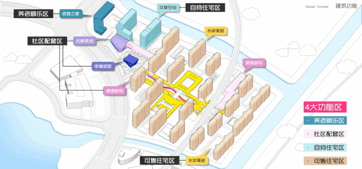 社区由自持住宅、可售住宅、社区配套三大功能组合而成,北区为公区自持配套区,中区为住宅社区,南区为住宅社区及配套。一条连续的公共通廊由海天湖公园引入社区,贯穿三大功能结构区。