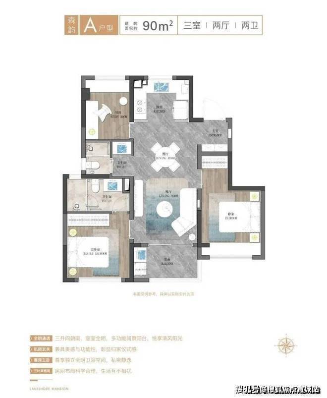 建面约90㎡三房,经典飞机户型,南北通透,餐客厅一体,减少空间浪费