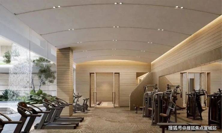 区域首创国标壁球馆、飞瀑园景健身房、嵌入式景观书吧等,整体统一化仿树榴木纹贴面,还原内外统一的高级度假酒店质感。
