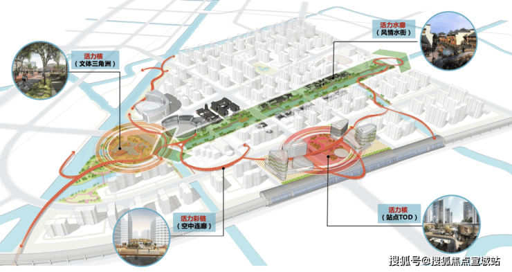 作为城市发展商角色的中交城投,正在为华新未来的发展谋划一盘“大棋”,打造以示范线-徐乐北路站TOD为主导,通过以历史文脉、科创体验及绿色生态为核心的复合站前体验区;打造科创TOD街区,融合了东方水镇,生态与文化的交融,形成“街、桥、寺”的水镇空间。