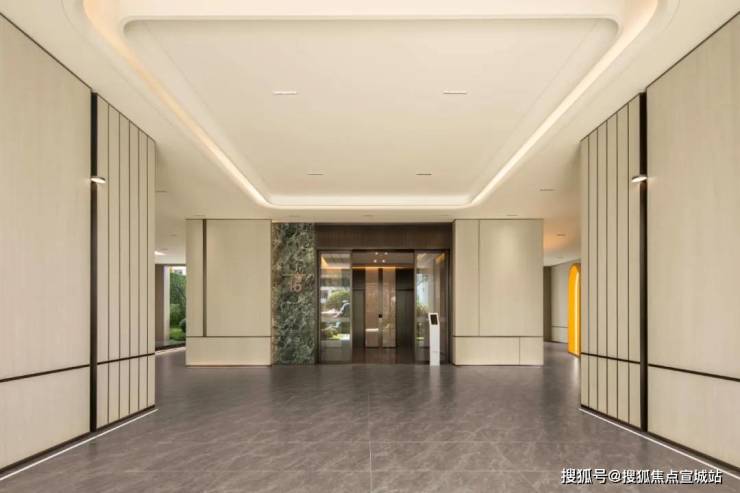 门庭。这里特指单元门庭,通高约4m,气势恢宏。大面积的金属屋檐外挑,彰显贵胄的同时,又扩大遮风挡雨的面积。进门左侧,色彩饱满的普拉达绿竖版镶嵌,美学传达与奢华品质相辅相成。进门后,又是大幅岩板上墙,气质拉满。