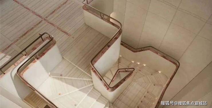 艺术旋转楼梯进入,整块白木纹石材切割+宝格丽粉镶边设计的旋转楼梯,营造社区高雅氛围,步步生花。