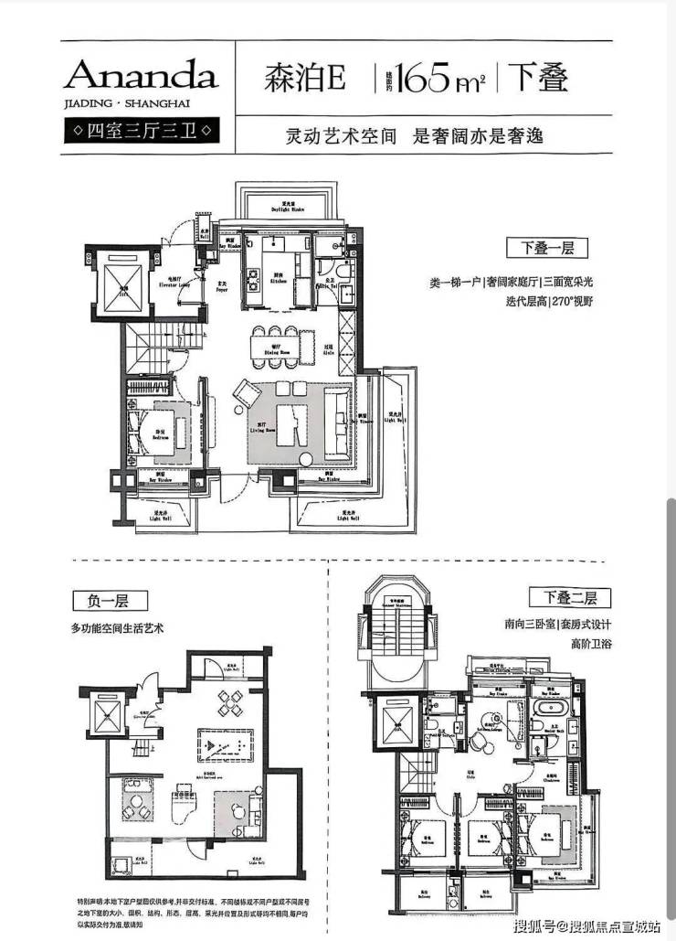 建面约165㎡下叠 预计使用率最高约148%、三向采光地下、LDBKG双入户流线、南北通透主卧套房