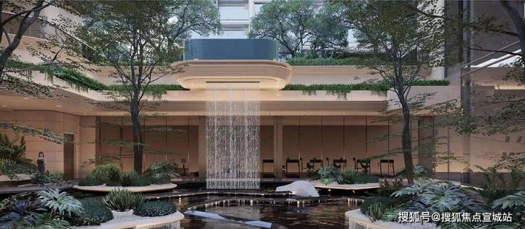 “漂浮的绿洲”,九重层次下沉庭院,区域悬浮泳池+4.3米飞瀑设计,塑造极致度假感受,丰富的视觉奇观。