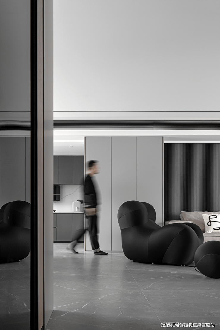 设计中贯穿的开放式布局,抛却了传统封闭的束缚,使各功能区自然而然地相互融合。黑色的异形沙发如一曲动感的旋律,注入了空间活力,其多处凸起的设计,更是贴合身体曲线,为居者带来舒适无比的体验。