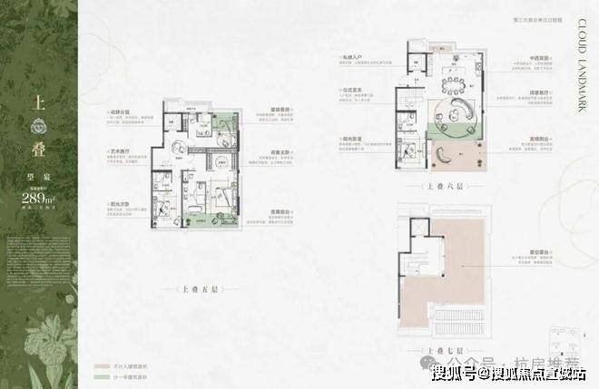 建面约289方上叠户型,一层阳台、主卧套间连通,阳光次卧、星级客房,还带家庭厅;二层宽境大露台、餐客厅、厨房等,可打造洄游式欢聚场……