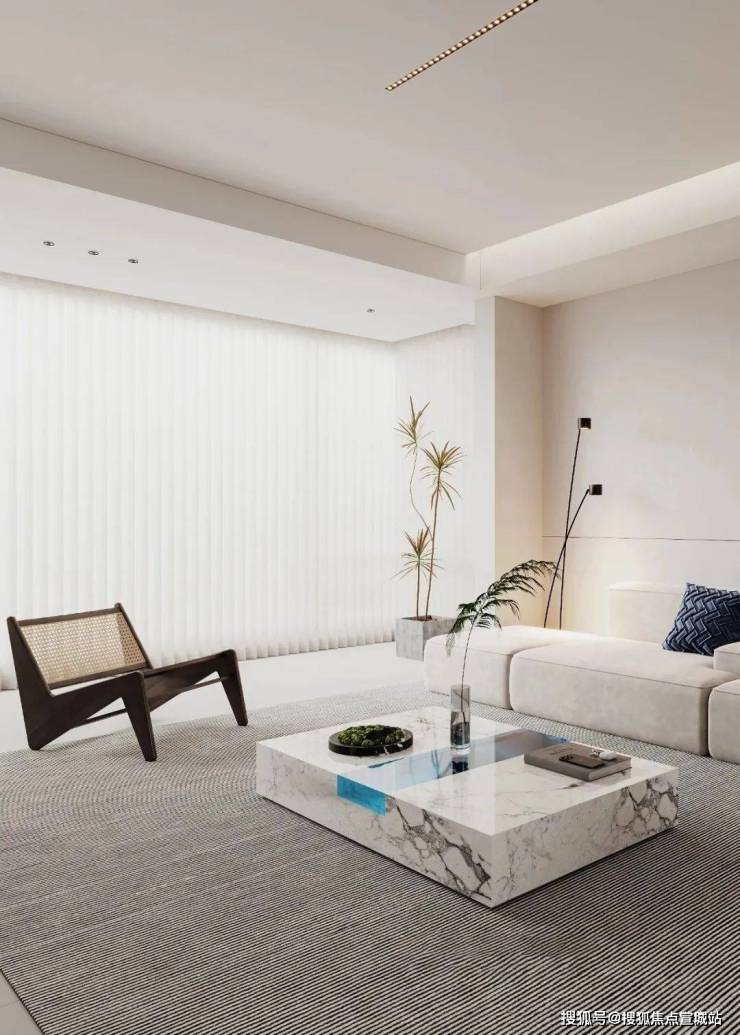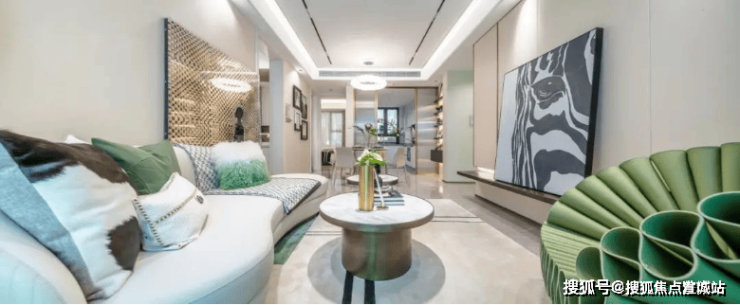 客厅和主卧都标配悬浮吊顶、无主灯设计,背景墙采用皮革和铝合金拼接,也都是实体交付的。