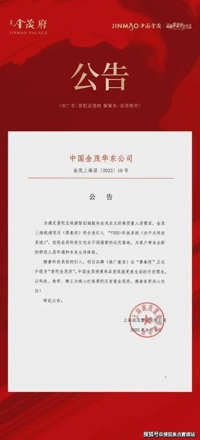 2023年9月4日,中国金茂华东公司发布一则公告:金茂上海桃浦项目(景泰府)更名为普陀金茂府。